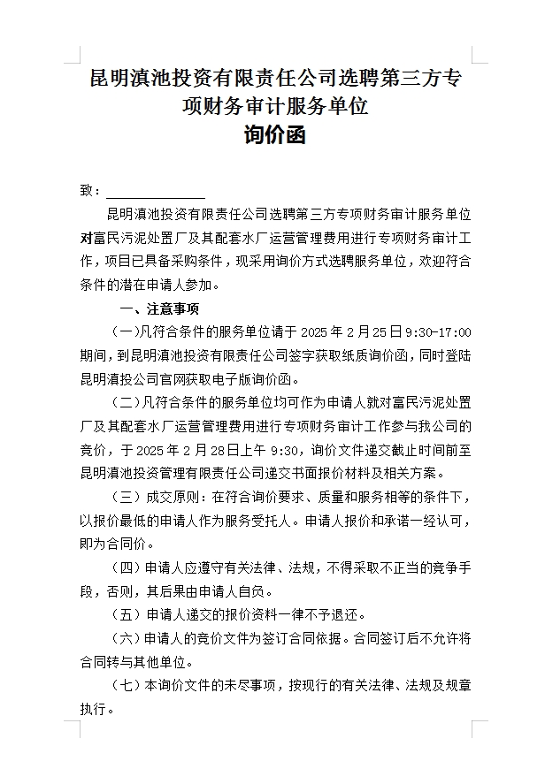 昆明滇池投資有限責(zé)任公司選聘第三方專項(xiàng)財(cái)務(wù)審計(jì)服務(wù)單位詢價(jià)函