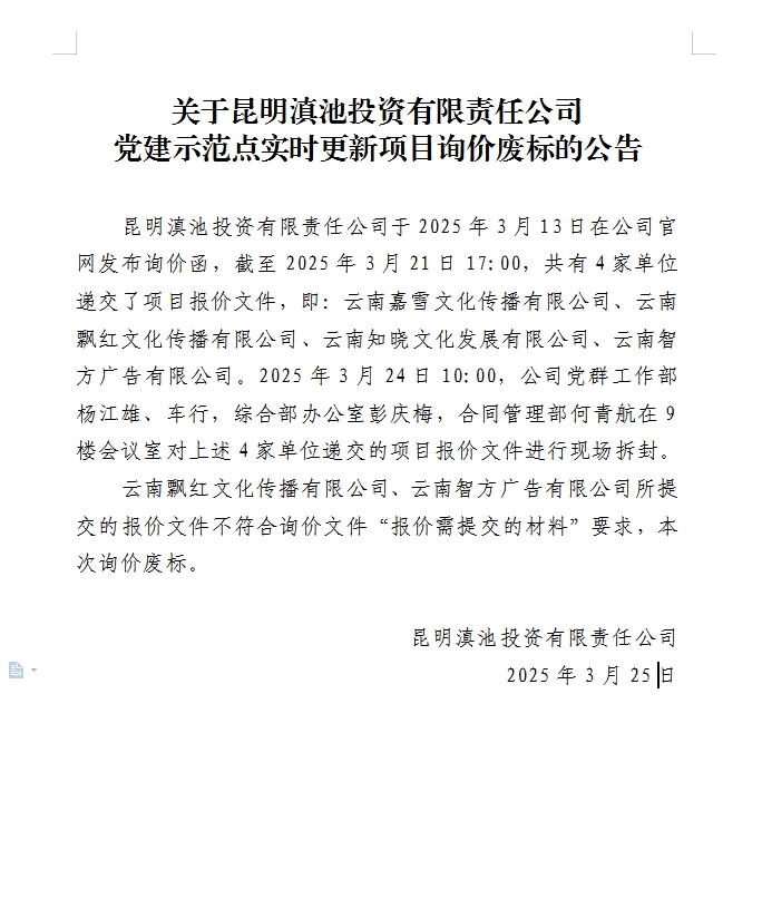 >關于昆明滇池投資有限責任公司黨建示范點實時更新項目詢價廢標的公告