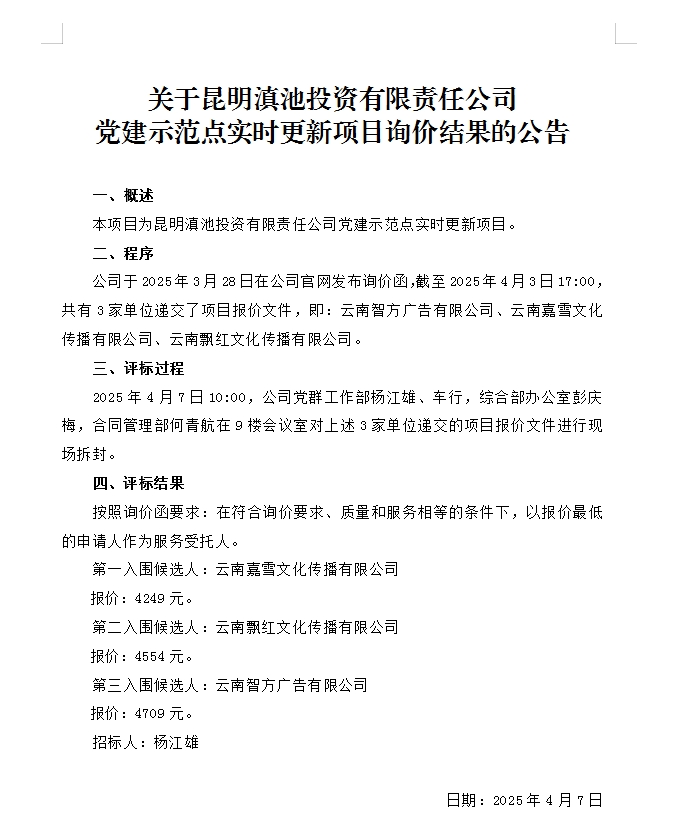 關(guān)于昆明滇池投資有限責(zé)任公司黨建示范點(diǎn)實(shí)時(shí)更新項(xiàng)目詢價(jià)結(jié)果的公告